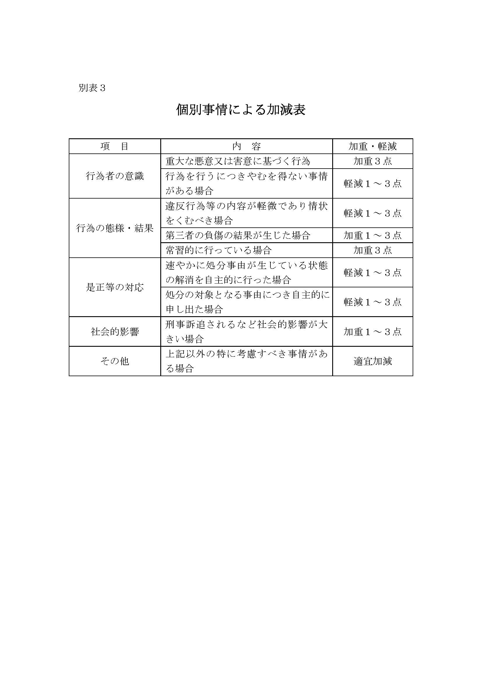 別表1処分事由の行為について、別表3個別事情による加減表の項目があると認められるときは